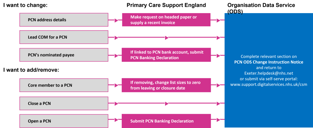 PCSE will then receive the changes from ODS and will update the PCN system, however, please note that if the change relates to the creation of a new PCN that the Commissioner will need to submit a separate bank change form to PCSE as this is not included within the changes received from ODS.