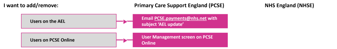 Any changes, additions or removals to the Authorised Email List should be sent by e-mail to the PCSE.Payments@nhs.net with the subject “AEL update”.